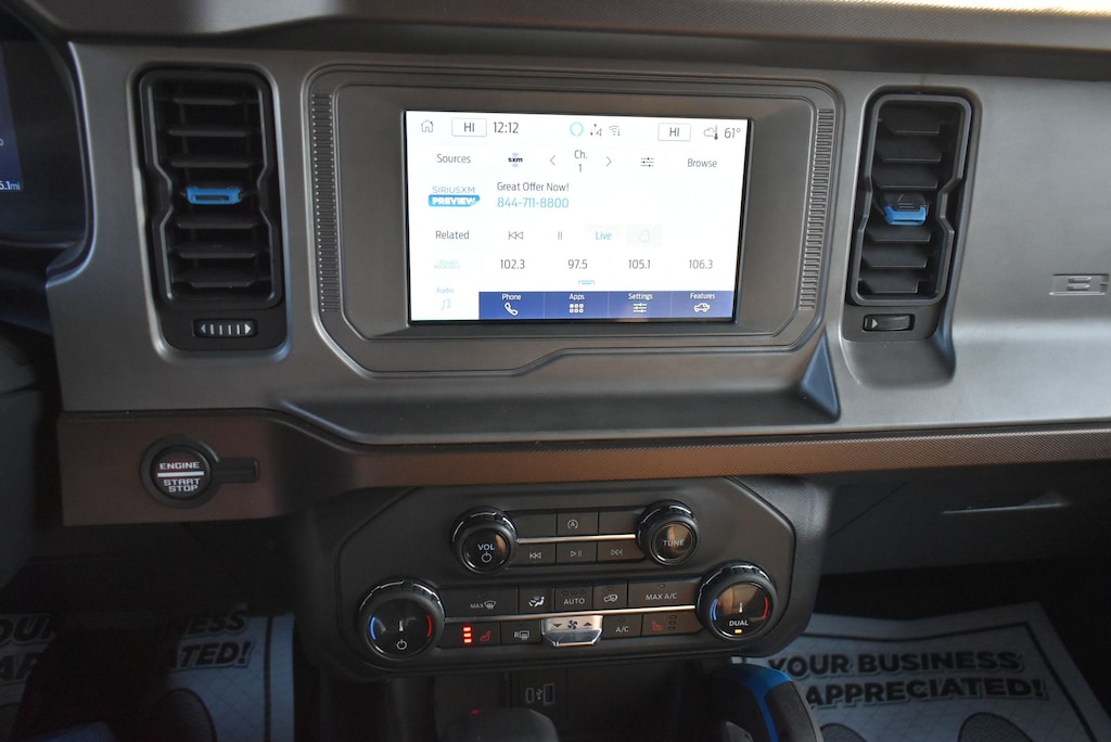 Glockner Ford Southpoint is proud to offer this superb 2022 Ford Bronco in Shadow Black. This 2022 Ford Bronco has passed our comprehensive inspection and comes with the following features; Equipment Group 312A Mid Package, Ford Blue Advantage: Blue Certified Certified, 18" Bright Machined Aluminum Wheels, 3.73 Axle Ratio, 4-Wheel Disc Brakes, 6 Speakers, ABS brakes, Air Conditioning, Alloy wheels, AM/FM radio: SiriusXM with 360L, AM/FM Stereo, Auto High-beam Headlights, Auto-dimming Rear-View mirror, Automatic temperature control, Brake assist, Compass, Connected Navigation, Delay-off headlights, Driver door bin, Driver vanity mirror, Dual front impact airbags, Dual front side impact airbags, Electronic Stability Control, Emergency communication system: 911 Assist, Exterior Parking Camera Rear, Front anti-roll bar, Front Bucket Seats, Front Center Armrest, Front dual zone A/C, Front fog lights, Front reading lights, Front wheel independent suspension, Fully automatic headlights, Heated Cloth Bucket Seats, Heated door mirrors, Heated front seats, Illuminated entry, Integrated roll-over protection, Leather Shift Knob, Navigation Removal, Navigation system: Connected Navigation, Occupant sensing airbag, Outside temperature display, Overhead airbag, Overhead console, Panic alarm, Passenger door bin, Passenger vanity mirror, Power door mirrors, Power steering, Power windows, Radio data system, Remote keyless entry, Removable Hoop Step, Security system, SiriusXM Radio w/360L, Speed control, Split folding rear seat, Steering wheel mounted audio controls, SYNC 4, Tachometer, Telescoping steering wheel, Tilt steering wheel, Traction control, Trip computer, Variably intermittent wipers, and Voltmeter.