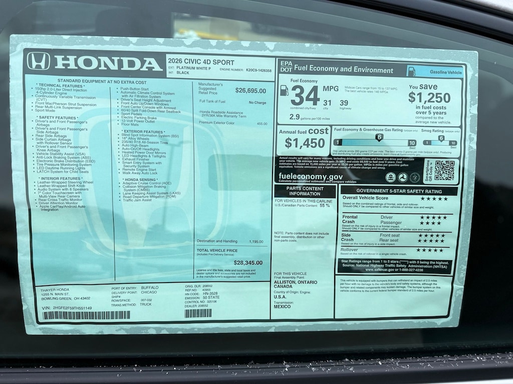 Boasting a powerful 2.0L I4 DOHC 16V engine paired with a responsive CVT transmission, the 2026 Civic Sport delivers an exhilarating drive while maintaining impressive fuel efficiency, with an EPA-estimated 31 MPG in the city and 39 MPG on the highway. The vehicle's sleek and aerodynamic design not only turns heads but also contributes to its exceptional performance and handling.