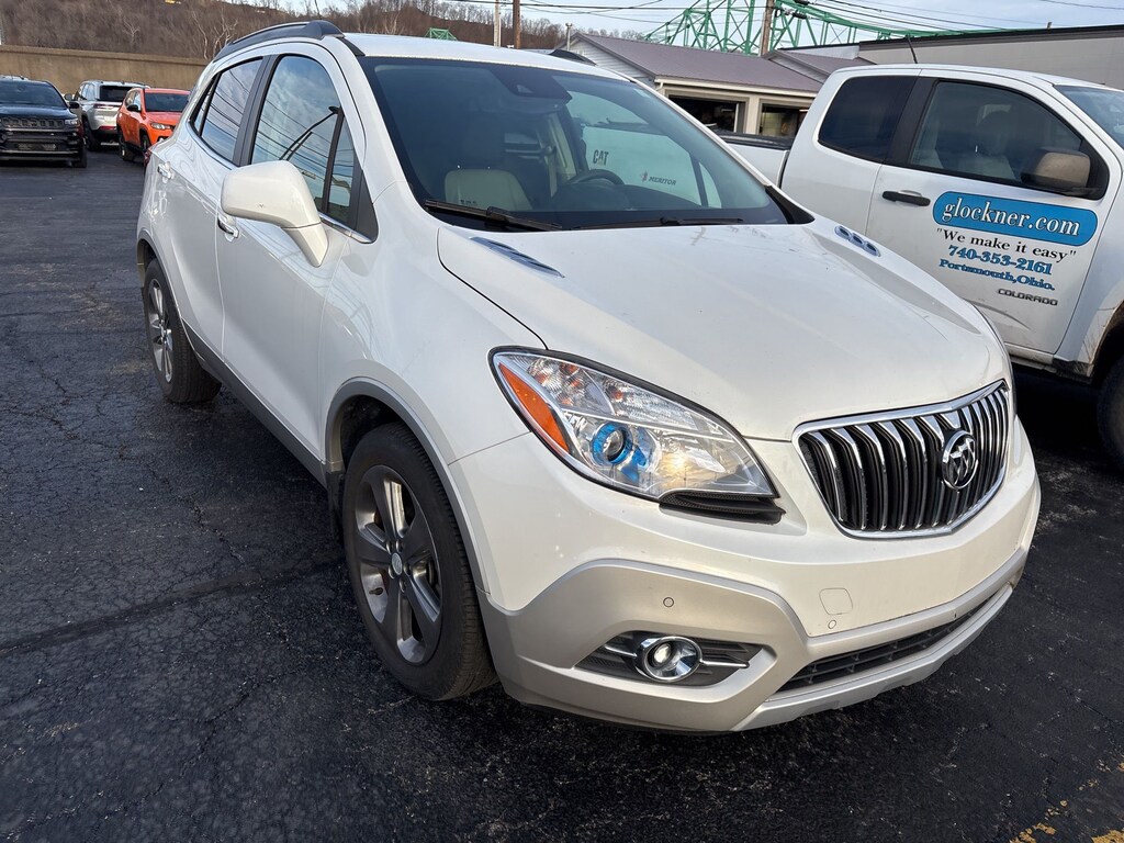 Glockner Chrysler Dodge Jeep Ram of Ashland is proud to offer this fantastic 2013 Buick Encore in White Pearl Tricoat. This 2013 Buick Encore has passed our comprehensive inspection and comes with the following features; 1SN Equipment Group (120-Volt Power Outlet, Auto-Dimming Inside Rear-View Mirror, Bose Premium 7-Speaker Audio System Feature, Carpeted Load Floor Mat, Dual-Zone Automatic Climate Control, Forward Collision Alert, Front Fog Lamps, Lane Departure Warning System, Rainsense Intermittent Front Wipers, Rear Cargo Net, Remote Vehicle Starter System, and Ultrasonic Front & Rear Park Assist), 3.53 Final Drive Ratio, 4-Wheel Disc Brakes, 7 Speakers, ABS brakes, Air Conditioning, Alloy wheels, AM/FM radio: SiriusXM, Auto-dimming Rear-View mirror, Automatic temperature control, Brake assist, Bumpers: body-color, CD player, Compass, Delay-off headlights, Driver door bin, Driver vanity mirror, Driver's Seat Mounted Armrest, Dual front impact airbags, Dual front side impact airbags, Electronic Stability Control, Emergency communication system: OnStar Directions & Connections, Exterior Parking Camera Rear, Front & Rear Custom Molded Splash Guards, Front anti-roll bar, Front Bucket Seats, Front dual zone A/C, Front fog lights, Front License Plate Bracket, Front reading lights, Front wheel independent suspension, Fully automatic headlights, Heated door mirrors, Heated Driver & Front Passenger Seats, Heated front seats, Heated steering wheel, Illuminated entry, Knee airbag, Leather steering wheel, Leather-Appointed Seat Trim, Low tire pressure warning, Memory seat, Occupant sensing airbag, Outside temperature display, Overhead airbag, Panic alarm, Passenger door bin, Passenger vanity mirror, Power door mirrors, Power driver seat, Power passenger seat, Power steering, Power Tilt-Sliding Sunroof, Power windows, Premium audio system: IntelliLink, Radio data system, Radio: AM/FM Audio System w/MP3 CD Player, Radio: AM/FM Audio System w/Nav/Single CD Player, Rain sensing wipers, Rear seat center armrest, Rear side impact airbag, Rear window defroster, Rear window wiper, Remote keyless entry, Ride & Handling Suspension, Roof rack: rails only, Security system, SiriusXM Satellite Radio, Speed control, Speed-sensing steering, Split folding rear seat, Spoiler, Steering wheel mounted audio controls, Tachometer, Telescoping steering wheel, Tilt steering wheel, Traction control, Trip computer, Variably intermittent wipers, and Wheels: 18" Painted Cast Aluminum.