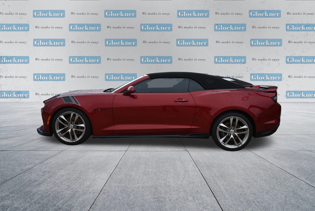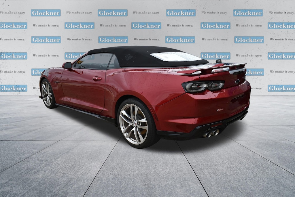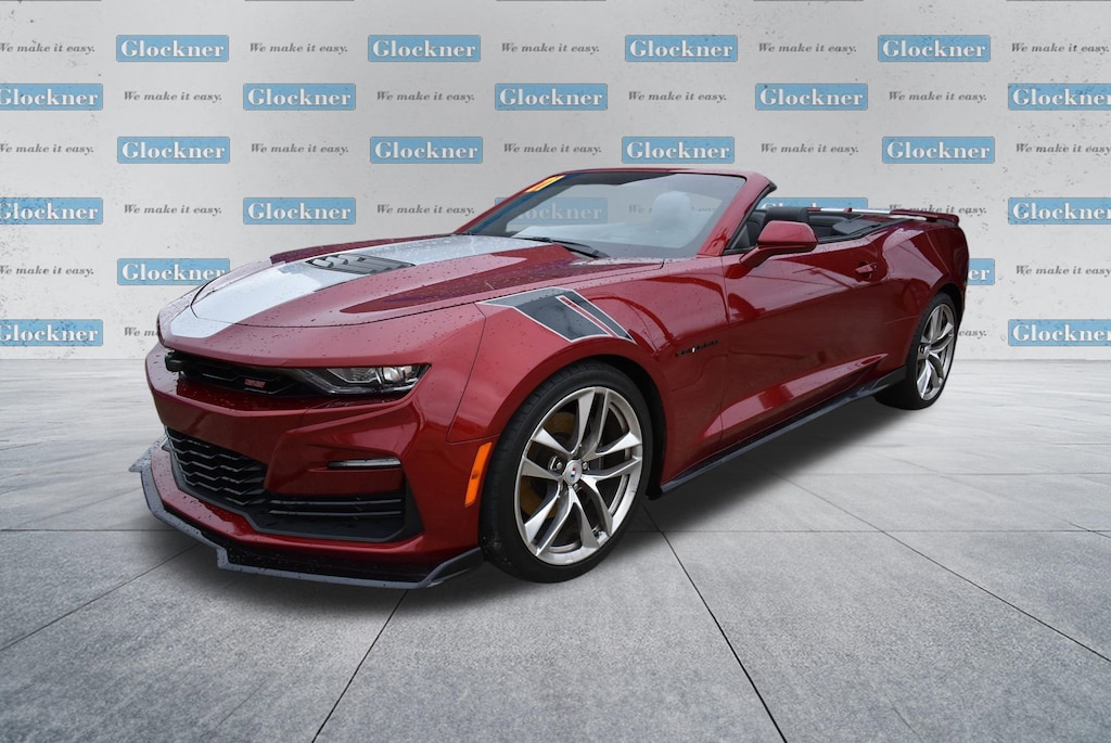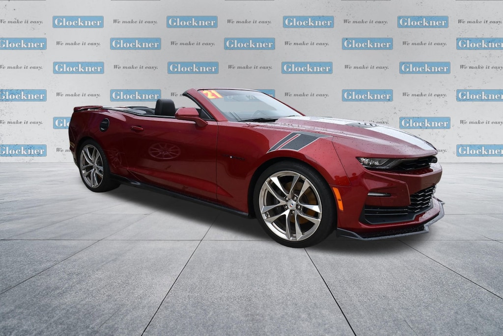 Certified. Certification Program Details: 12 Months or 12,000 miles Comprehensive Warranty. 5 Years or 100,000 miles Powertrain Warranty.Glockner of Ironton is proud to offer this good-looking 2021 Chevrolet Camaro in Wild Cherry Tintcoat. This 2021 Chevrolet Camaro has passed our comprehensive inspection and comes with the following features; Preferred Equipment Group 2SS, Wild Cherry Design Package 1 (Black Camaro Emblem Fender Badge, Black Metallic Hash Mark Stripes (LPO), Camaro Logo Wheel Center Caps (LPO), Premium Carpeted Floor Mats w/Camaro Logo (LPO), and Wheels: 20 x 8.5 Fr/20 x 9.5 Rr 5-Split Spoke), Wild Cherry Design Package 2 (Black Fuel Filler Door (LPO), Black Sueded Knee Pads (LPO), and Second Generation Ground Effects (LPO)), Glockner Certified Certified, 2.77 Rear Axle Ratio, 4-Wheel Disc Brakes, 6-Way Power Front Passenger Seat Adjuster, 7 Speakers, 8-Way Power Driver Seat Adjuster, ABS brakes, Air Conditioning, Alloy wheels, AM/FM radio: SiriusXM with 360L, Apple CarPlay/Android Auto, Auto-dimming door mirrors, Automatic temperature control, Bluetooth® For Phone, Bose Premium 7-Speaker Audio System Feature, Brake assist, Bumpers: body-color, Compass, Convertible roof lining, Custom Launch Control, Delay-off headlights, Driver door bin, Driver vanity mirror, Dual front impact airbags, Dual front side impact airbags, Dual Mode Exhaust, Electronic Stability Control, Exterior Parking Camera Rear, Four wheel independent suspension, Front anti-roll bar, Front Bucket Seats, Front Center Armrest, Front dual zone A/C, Front reading lights, Front Sport Bucket Seats, Fully automatic headlights, Glass rear window, Heads-Up Display, Heated door mirrors, Heated Driver & Front Passenger Seats, Heated front seats, Heated steering wheel, Illuminated entry, Knee airbag, Leather Shift Knob, Leather-Trimmed Seat Trim, Low tire pressure warning, Memory seat, Occupant sensing airbag, Outside temperature display, Paddle-Shift Manual Controls, Panic alarm, Passenger door bin, Passenger vanity mirror, Power convertible roof, Power door mirrors, Power driver seat, Power passenger seat, Power steering, Power windows, Premium audio system: Chevrolet Infotainment System, Radio data system, Radio: Chevrolet Infotainment 3 Plus System, Rear anti-roll bar, Rear window defroster, Remote keyless entry, Remote Vehicle Starter System, Security system, Silver Center Stripe, SiriusXM w/360L, Speed control, Speed-sensing steering, Spoiler, Steering wheel mounted audio controls, Tachometer, Telescoping steering wheel, Tilt steering wheel, Traction control, Transmission Oil Cooler, Trip computer, Variably intermittent wipers, Ventilated Driver & Front Passenger Seats, Ventilated front seats, Voltmeter, and Wheels: 20 x 8.5 Fr & 20 x 9.5 Rr 5-Spoke Alum.16/26 City/Highway MPG