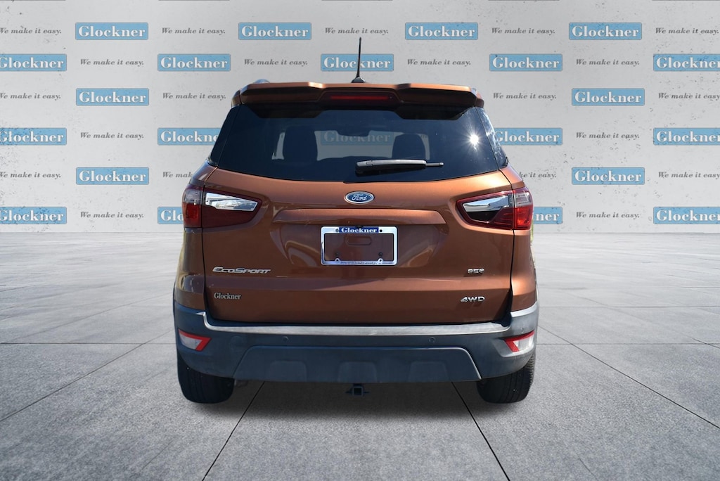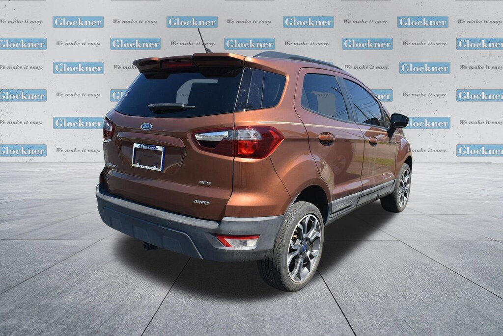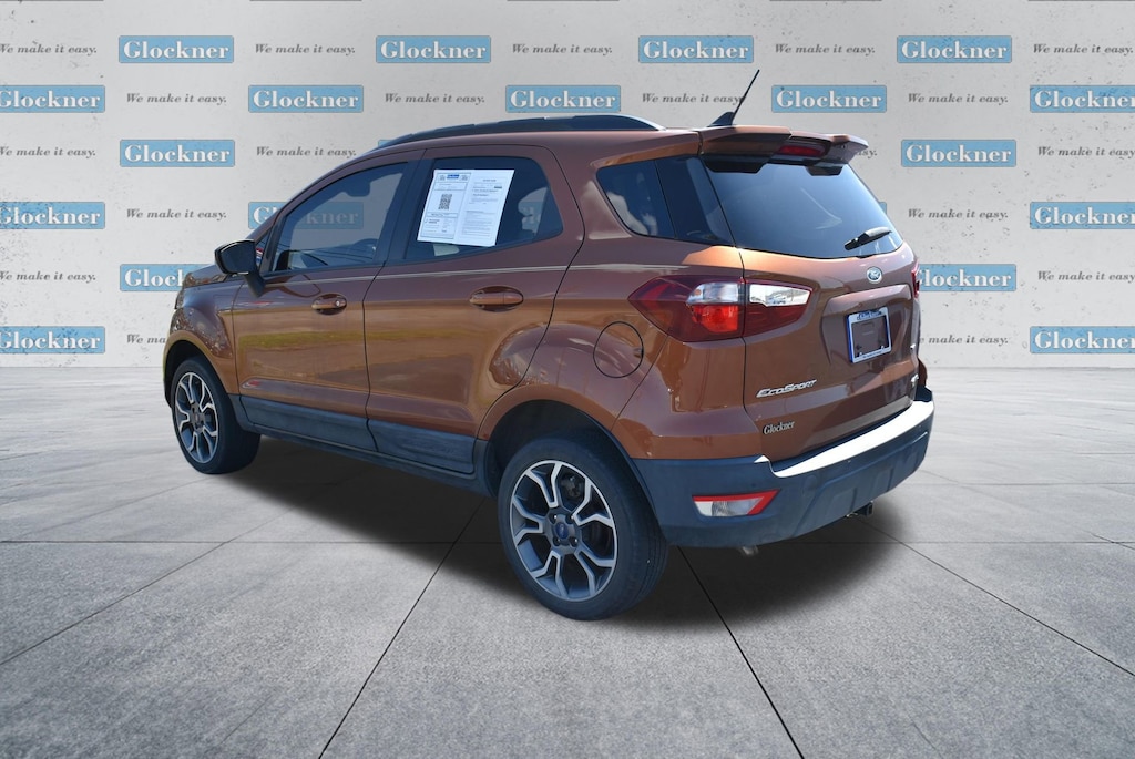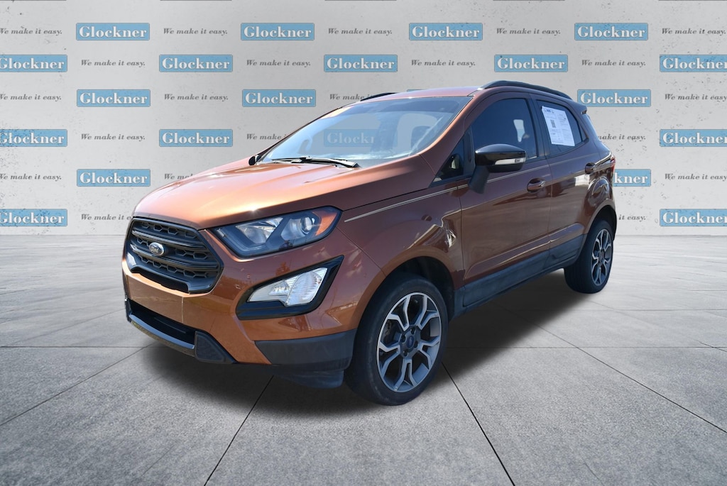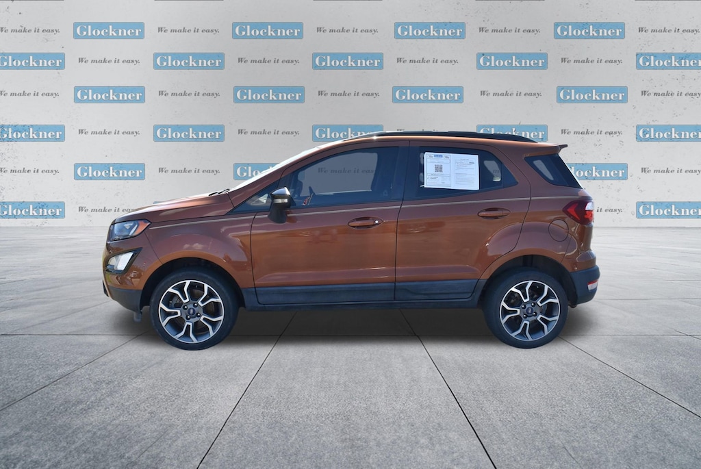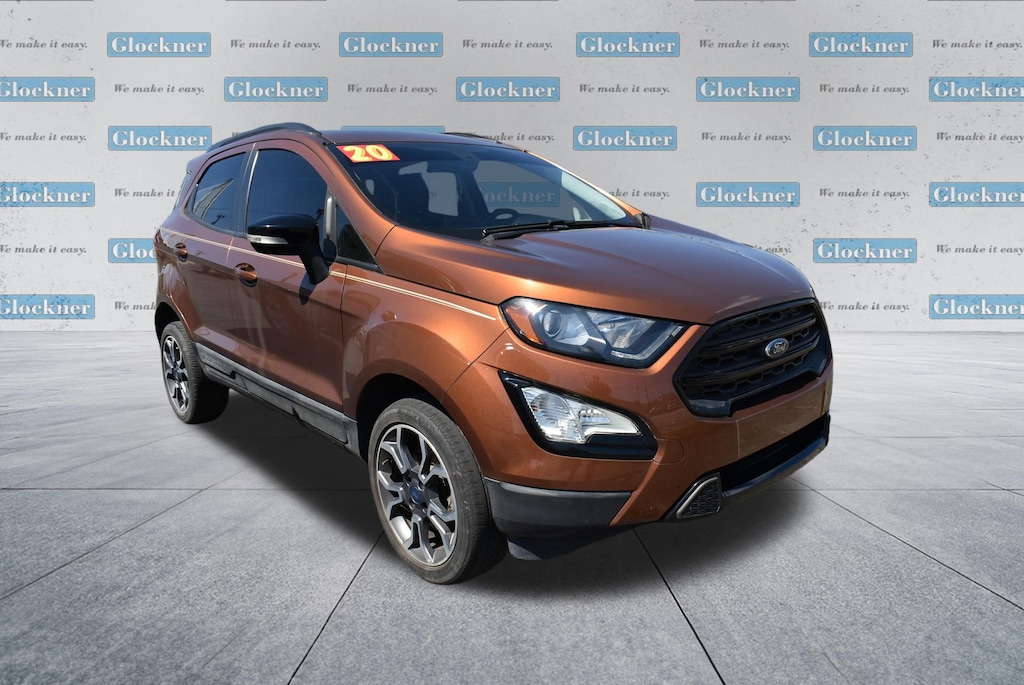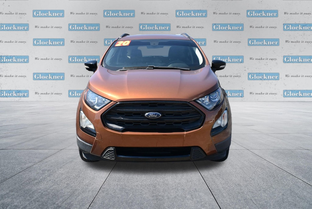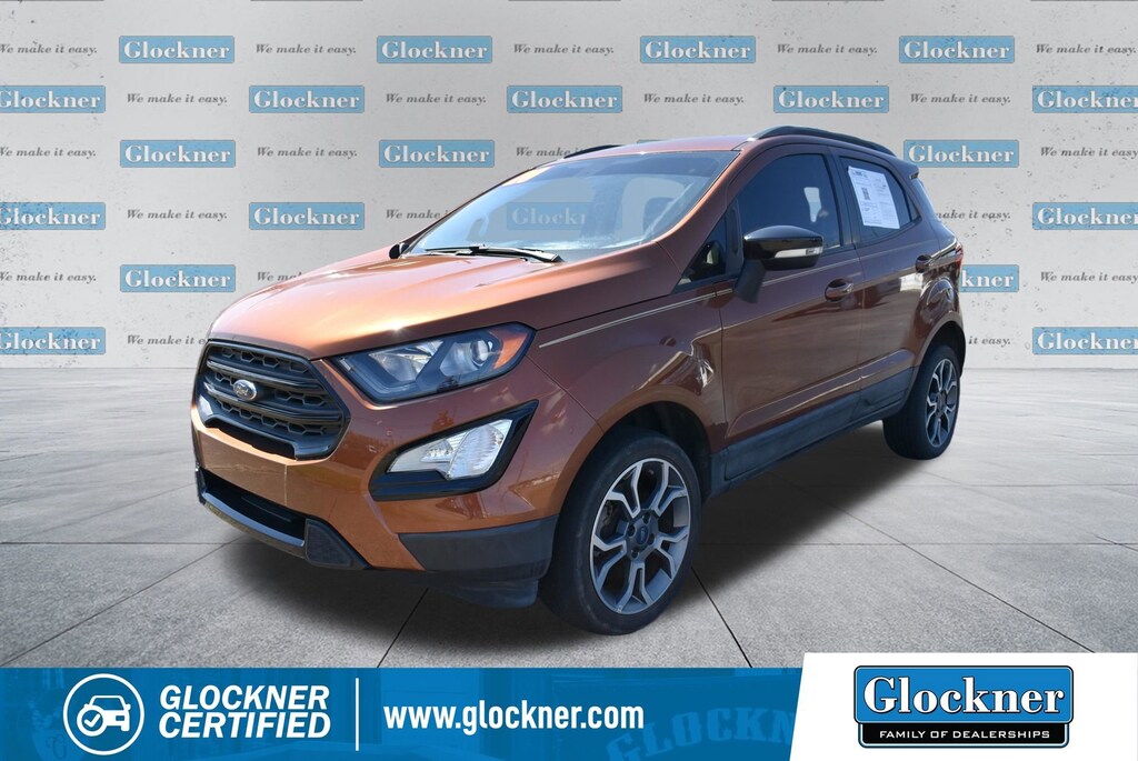 Certified. Certification Program Details: 12 Months or 12,000 miles Comprehensive Warranty. 5 Years or 100,000 miles Powertrain Warranty.Glockner of Ironton is proud to offer this great-looking 2020 Ford EcoSport in Canyon Ridge Metallic. This 2020 Ford EcoSport has passed our comprehensive inspection and comes with the following features; Equipment Group 300A, Glockner Certified Certified, 3.51 Axle Ratio, 4-Wheel Disc Brakes, 7 Speakers, ABS brakes, ActiveX Seating Material Heated Front Bucket Seats, Air Conditioning, Alloy wheels, AM/FM radio: SiriusXM, AppLink/Apple CarPlay and Android Auto, Auto-dimming Rear-View mirror, Automatic temperature control, Brake assist, Bumpers: body-color, Compass, Delay-off headlights, Driver door bin, Driver vanity mirror, Dual front impact airbags, Dual front side impact airbags, Electronic Stability Control, Emergency communication system: SYNC 3 911 Assist, Exterior Parking Camera Rear, Front anti-roll bar, Front Bucket Seats, Front Center Armrest, Front fog lights, Front reading lights, Front wheel independent suspension, Fully automatic headlights, Heated door mirrors, Heated front seats, Heated steering wheel, Illuminated entry, Knee airbag, Leather Shift Knob, Low tire pressure warning, Navigation System, Occupant sensing airbag, Outside temperature display, Overhead airbag, Overhead console, Panic alarm, Passenger door bin, Passenger vanity mirror, Power door mirrors, Power driver seat, Power moonroof, Power steering, Power windows, Radio data system, Radio: AM/FM Stereo w/MP3 Capable, Rain sensing wipers, Rear anti-roll bar, Rear Parking Sensors, Rear seat center armrest, Rear side impact airbag, Rear window defroster, Rear window wiper, Remote keyless entry, Roof rack: rails only, SiriusXM Radio, SiriusXM Traffic & Travel Link, Speed control, Speed-sensing steering, Split folding rear seat, Spoiler, Steering wheel mounted audio controls, SYNC 3 Communications & Entertainment System, Tachometer, Telescoping steering wheel, Tilt steering wheel, Traction control, Trip computer, Turn signal indicator mirrors, Variably intermittent wipers, and Wheels: 17 Painted Machined Aluminum.23/29 City/Highway MPG