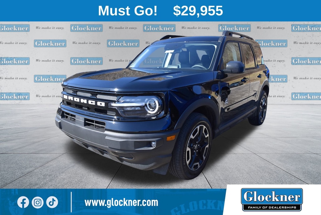Certified. Certification Program Details: 12 Months or 12,000 miles Comprehensive Warranty. 5 Years or 100,000 miles Powertrain Warranty.Glockner of Ironton is proud to offer this beautiful 2024 Ford Bronco Sport in Shadow Black. This 2024 Ford Bronco Sport has passed our comprehensive inspection and comes with the following features; Equipment Group 300A, Ford Co-Pilot360 Assist+ (Voice-Activated Touchscreen Navigation System, Evasive Steering Assist, and Intelligent Adaptive Cruise Control w/Stop & Go), Tech Package (Universal Garage Door Opener (UGDO), Wireless Charging Pad, and HD Radio), Glockner Certified Certified, 1.5L EcoBoost, 8-Speed Automatic, 4WD, 4-Wheel Disc Brakes, ABS brakes, Four wheel independent suspension, Front dual zone A/C, Heated door mirrors, Low tire pressure warning, Rain sensing wipers, Speed-sensing steering, Speed-Sensitive Wipers, SYNC 3 Communications & Entertainment System, Traction control, 3.80 Axle Ratio, 6 Speakers, Air Conditioning, Alloy wheels, AM/FM radio: SiriusXM, AM/FM Stereo, Auto High-beam Headlights, Auto-dimming Rear-View mirror, Automatic temperature control, Brake assist, Compass, Delay-off headlights, Driver door bin, Driver vanity mirror, Dual front impact airbags, Dual front side impact airbags, Electronic Stability Control, Emergency communication system: SYNC 3 911 Assist, Front anti-roll bar, Front Bucket Seats, Front Center Armrest, Front fog lights, Front reading lights, Fully automatic headlights, Heated front seats, Heated steering wheel, Illuminated entry, Knee airbag, Memory seat, Occupant sensing airbag, Outside temperature display, Overhead airbag, Overhead console, Panic alarm, Passenger door bin, Passenger vanity mirror, Power door mirrors, Power driver seat, Power passenger seat, Power steering, Power windows, Premium-Trimmed Heated Sport Contour Bucket Seats, Radio data system, Rear anti-roll bar, Rear Parking Sensors, Rear reading lights, Rear seat center armrest, Rear window defroster, Rear window wiper, Remote keyless entry, Security system, SiriusXM, Speed control, Split folding rear seat, Steering wheel mounted audio controls, Tachometer, Telescoping steering wheel, Tilt steering wheel, Trip computer, Variably intermittent wipers, and Wheels: 18 Ebony Black-Painted Aluminum.Alloy Rims, Leather Seating, Power Seats, Heated Seats, Sirius XM Satellite Radio, Navigation / GPS / NAV, Back Up Camera, Bluetooth, Remote Start, 1.5L EcoBoost, 8-Speed Automatic, 4WD, 4-Wheel Disc Brakes, ABS brakes, Four wheel independent suspension, Front dual zone A/C, Heated door mirrors, Low tire pressure warning, Rain sensing wipers, Speed-sensing steering, Speed-Sensitive Wipers, SYNC 3 Communications & Entertainment System, Traction control, Universal Garage Door Opener (UGDO), Voice-Activated Touchscreen Navigation System, Wireless Charging Pad.Odometer is 2895 miles below market average!25/29 City/Highway MPG