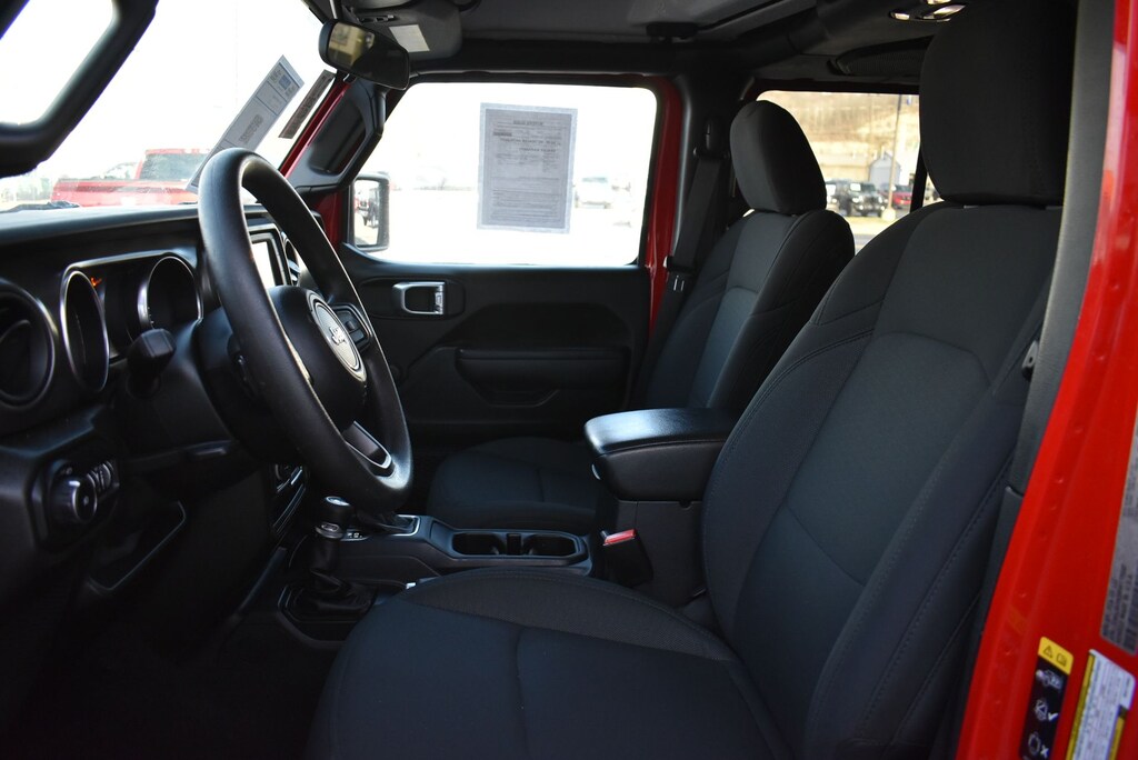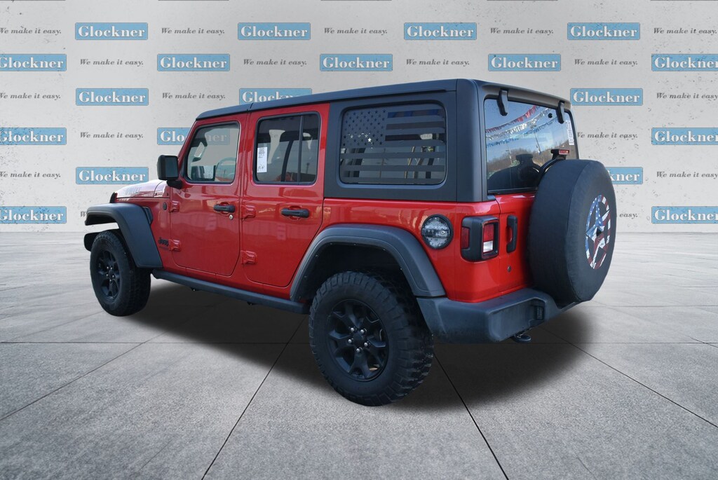 Glockner Chrysler Dodge Jeep Ram of Ashland is proud to offer this attractive-looking and fun 2021 Jeep Wrangler in Firecracker Red Clearcoat. This 2021 Jeep Wrangler has passed our comprehensive inspection and comes with the following features; Quick Order Package 22K Willys Sport (4-Wheel Drive Swing Gate Decal, Black Trail Rated Badge, Deep Tint Sunscreen Windows, Mold In Color Bumper w/Gloss Black, Willys Hood Decal, and Wrangler Decal), Glockner Certified Certified, 3.45 Rear Axle Ratio, 4-Wheel Disc Brakes, 8 Speakers, ABS brakes, Air Conditioning, AM/FM radio, Aux Battery, Black 3-Piece Hard Top, Brake assist, Cloth Low-Back Bucket Seats, Compass, Delay-off headlights, Driver door bin, Driver vanity mirror, Dual front impact airbags, Dual front side impact airbags, Electronic Stability Control, Front anti-roll bar, Front Bucket Seats, Front Center Armrest w/Storage, Front fog lights, Front reading lights, Integrated roll-over protection, Jeep Trail Rated Kit, Low tire pressure warning, MOPAR All-Weather Floor Mats (DISC), No Soft Top, Non-Lock Fuel Cap w/o Discriminator, Normal Duty Suspension, Occupant sensing airbag, Outside temperature display, ParkView Rear Back-Up Camera, Passenger door bin, Passenger vanity mirror, Power steering, Radio data system, Radio: Uconnect 3 w/5" Display, Rear anti-roll bar, Rear reading lights, Rear Window Defroster, Speed control, Split folding rear seat, Steering wheel mounted audio controls, Stop-Start Dual Battery System, Tachometer, Telescoping steering wheel, Tilt steering wheel, Traction control, Trip computer, Variably intermittent wipers, and Wheels: 17" x 7.5" Black Steel Styled.